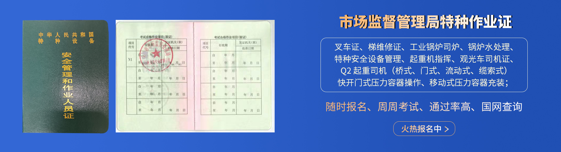 叉车证,电梯维修证,起重司机-桥式-门式-流动式,起重指挥,压力容器操作,锅炉司炉,水处理,特种设备管理,观光车;